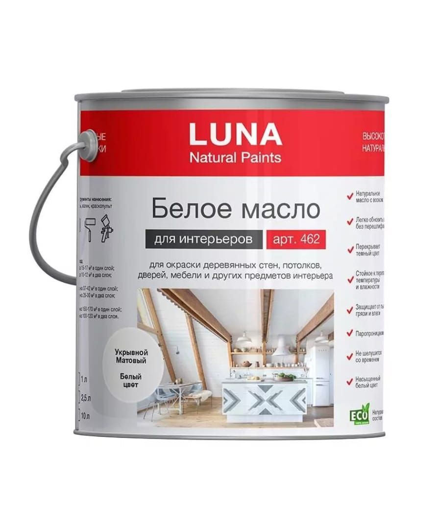 Паропроницаемое натуральное белое укрывное матовое масло для окраски стен, потолков, дверей, мебели из дерева и других предметов интерьера. Предназначено для шлифованной, строганой древесины любых пород.