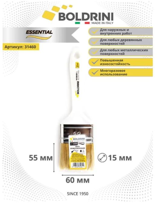 Профессиональная кисть Болдрини / Boldrini 60х15 мм из улучшенной натуральной щетины идеально подходит для всех видов красок.