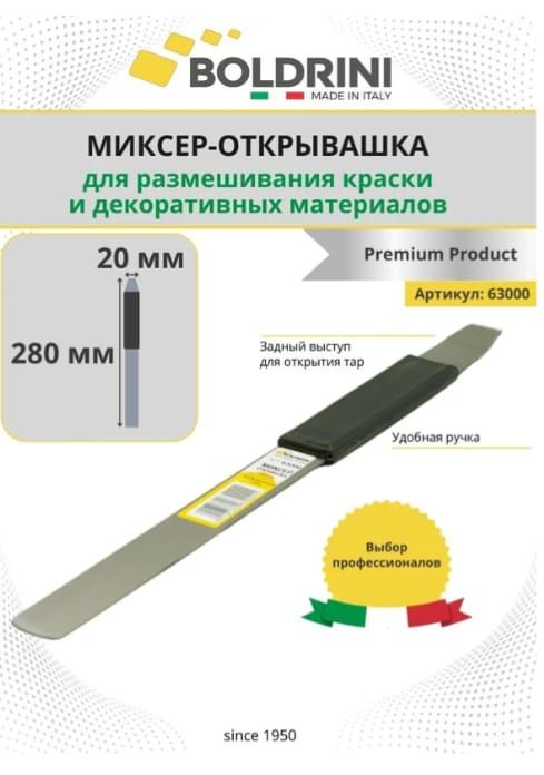Металлический миксер-открывалка 28 см Boldrini 63000 изготовлен из нержавеющей стали с пластиковой ручкой для перемешивания лакорасочных и декоративных материалов перед применением, а так же как ключ для открытия металлических банок.